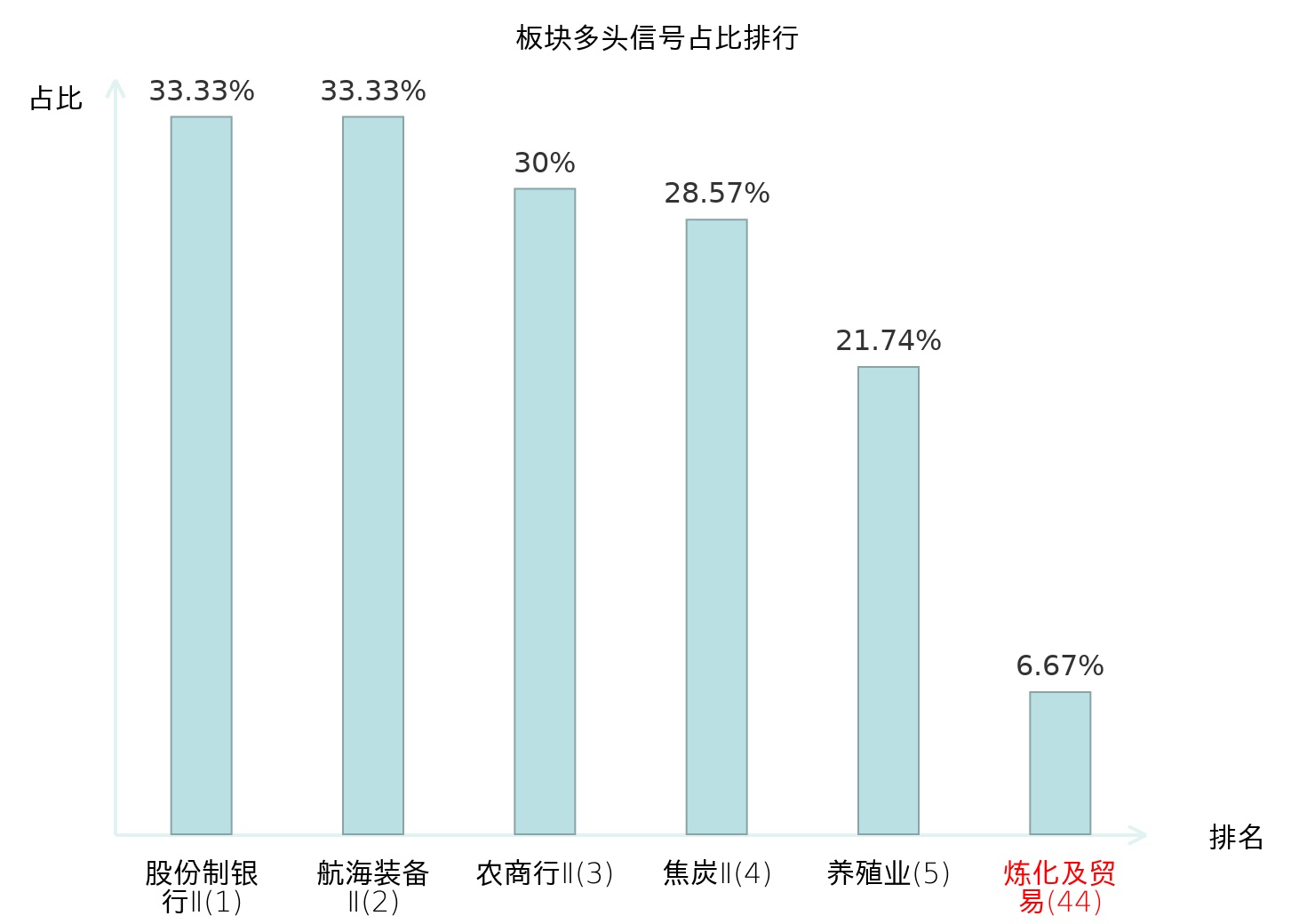 全市场所有行业板块中主力多头信号占比排名中,股份制银行Ⅱ板块位居第一。焦炭Ⅱ板块名次提升最快,较昨日上升119位。