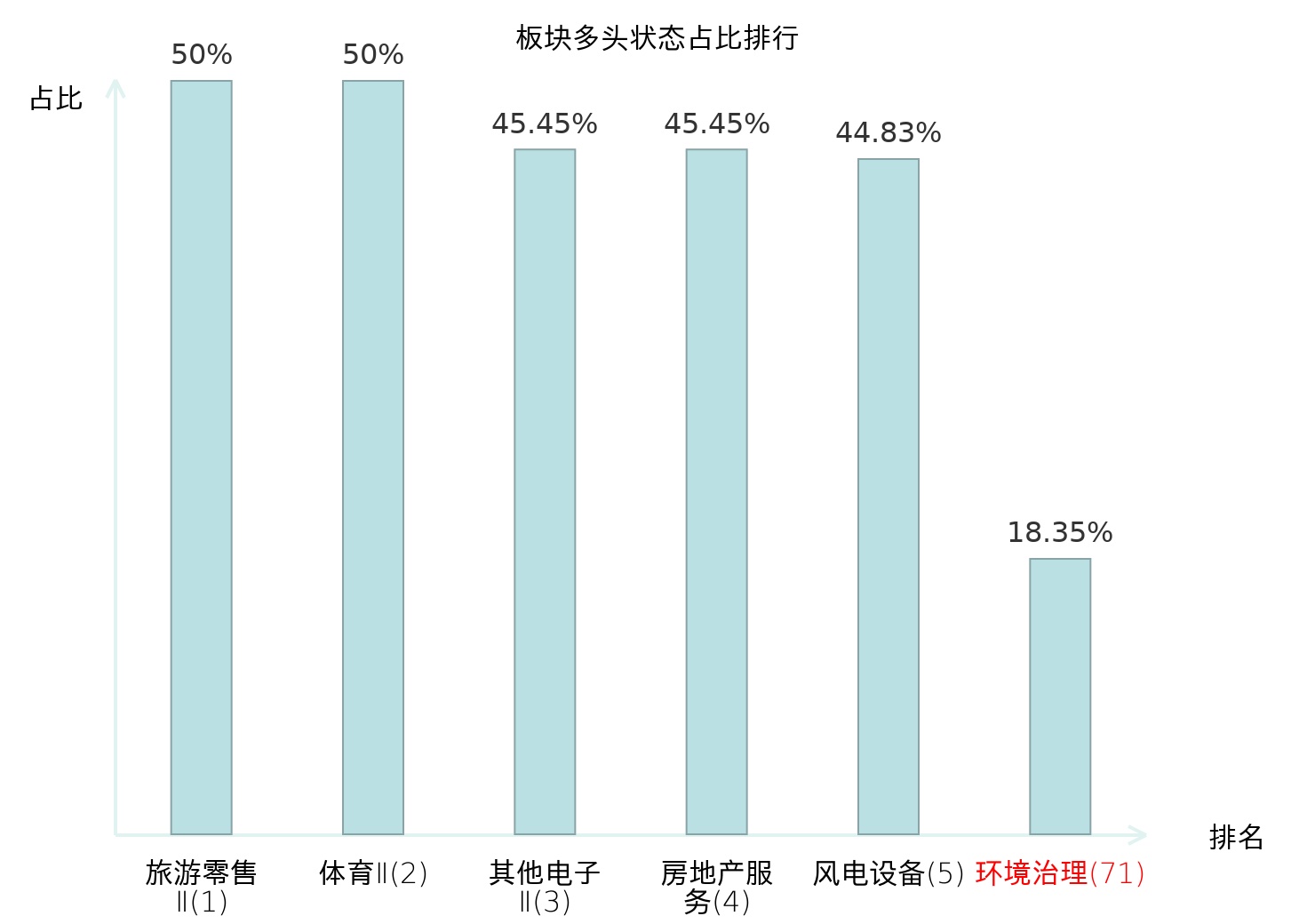 从主力宝信号数据分析,中创环保所属的环境治理板块中共20只股票处于主力多头状态,主力多头状态占比在全行业中排名第71位,较昨日上升2位;排名提升表明主力对于该板块整体看多意愿有所增强,此次小幅上升可能反映了主力对该板块态度的积极调整。全市场所有行业板块中主力多头状态占比排名中,旅游零售Ⅱ板块位居第一;其他家电Ⅱ板块名次提升最快,较昨日上升112位。这些变动揭示了不同行业间主力资金偏好的结构性变化,为投资者判断市场情绪分化与潜在关注方向提供了客观依据。