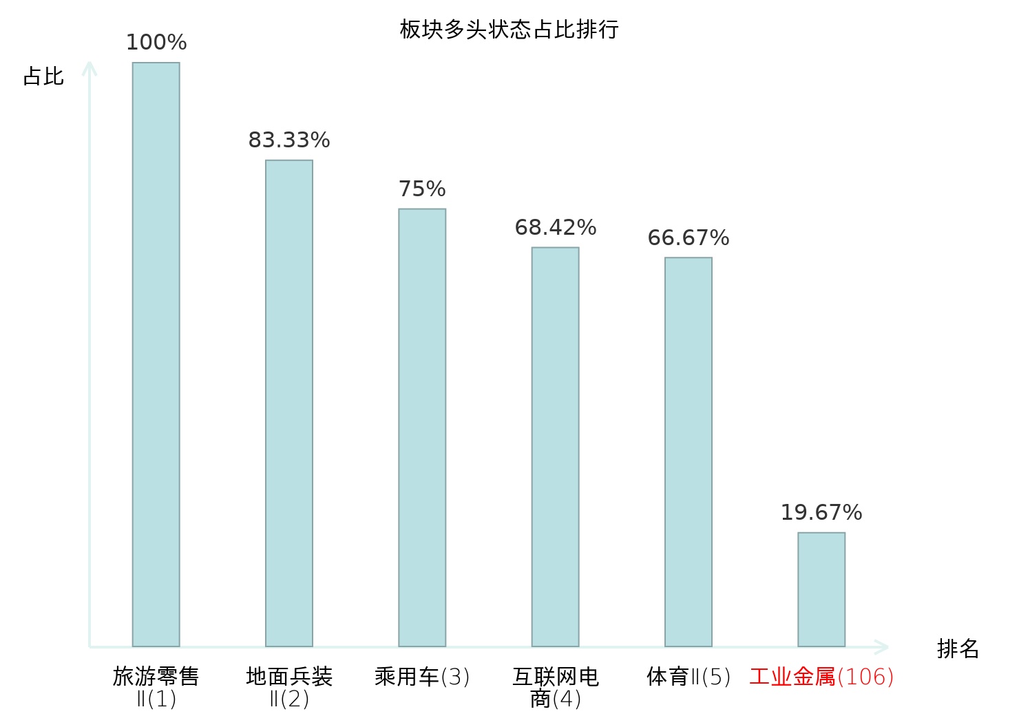 全市场所有行业板块中主力多头状态占比排名中,旅游零售Ⅱ板块位居第一。房屋建设Ⅱ板块名次提升最快,较昨日上升50位。