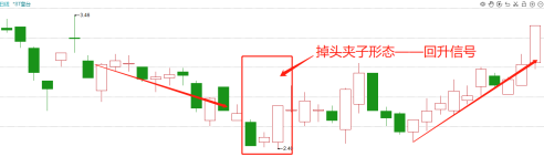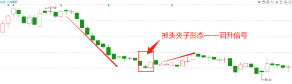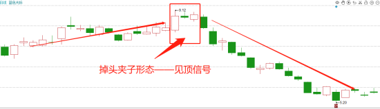 掉头夹子形态表明股价见顶,同时也是股价见底回升的信号。对其解读为: