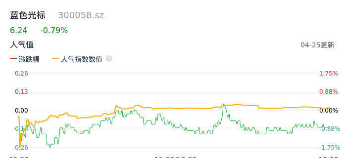 04月25日,蓝色光标收报6.24,股价涨幅-0.79%,成交金额3.44亿元,换手率2.31%。