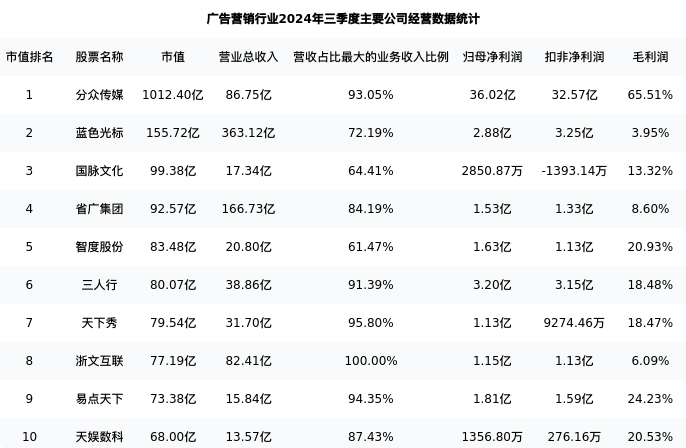 蓝色光标最新报告期数据为三季度,下表汇总了广告营销行业内市值靠前的公司三季度主要经营数据
