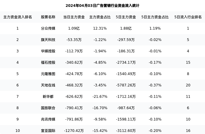 从主力资金流向来看,广告营销行业今日主力资金流入19.70亿元,在所有申万二级行业中排名:37/131。
