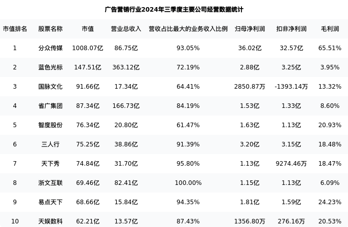 蓝色光标最新报告期数据为三季度,下表汇总了广告营销行业内市值靠前的公司三季度主要经营数据