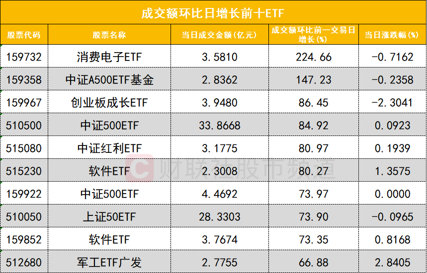 从成交额环比增长前十的ETF来看,消费电子ETF(159732)成交额环比增长224%位居首位;中证A500ETF基金(159358)成交额环比增长147%位居次席。