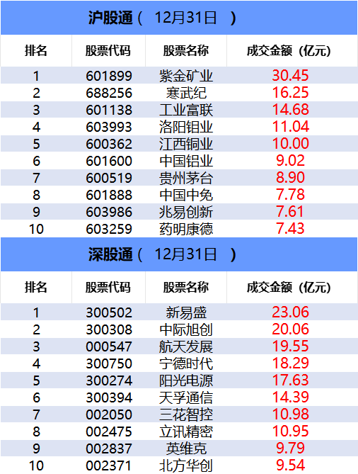 从沪股通前十大成交个股来看,紫金矿业位居首位;寒武纪和工业富联分居二、三位。