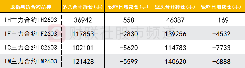 四大期指主力合约中,IF、IC、IM合约多空双方均减仓,IF、IC合约空头减仓数量较多。