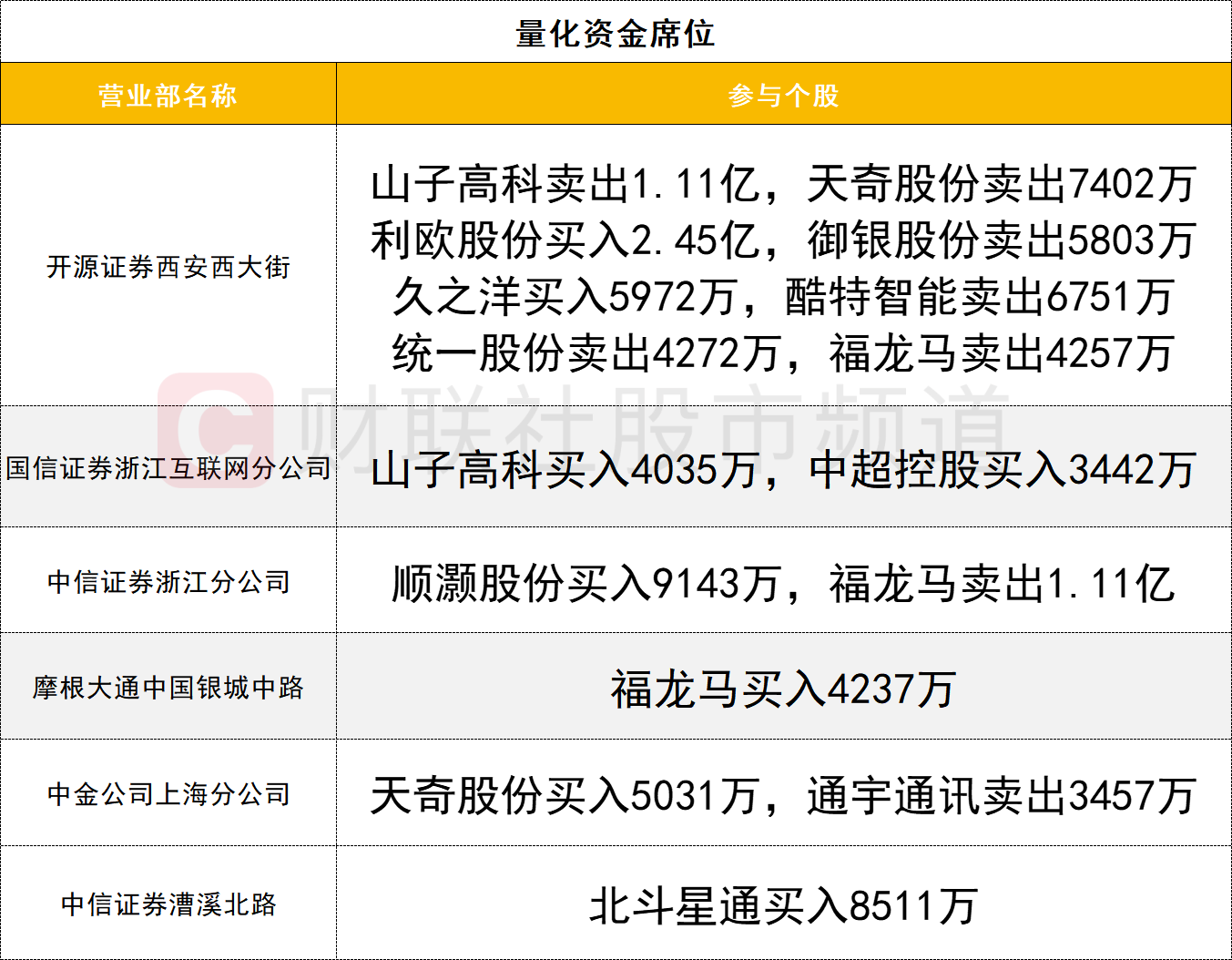 量化资金活跃度明显降低,福龙马获一家量化资金(摩根大通中国银城中路)买入0.42亿,同时遭两家量化资金(中信证券浙江分公司、开源证券西安西大街)分别卖出1.11亿、0.42亿。