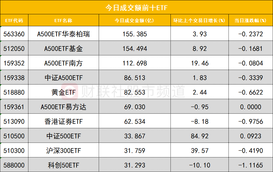 从成交额前十的ETF来看,A500ETF华泰柏瑞(563360)成交额位居首位,A500ETF基金(512050)成交额位居次席。