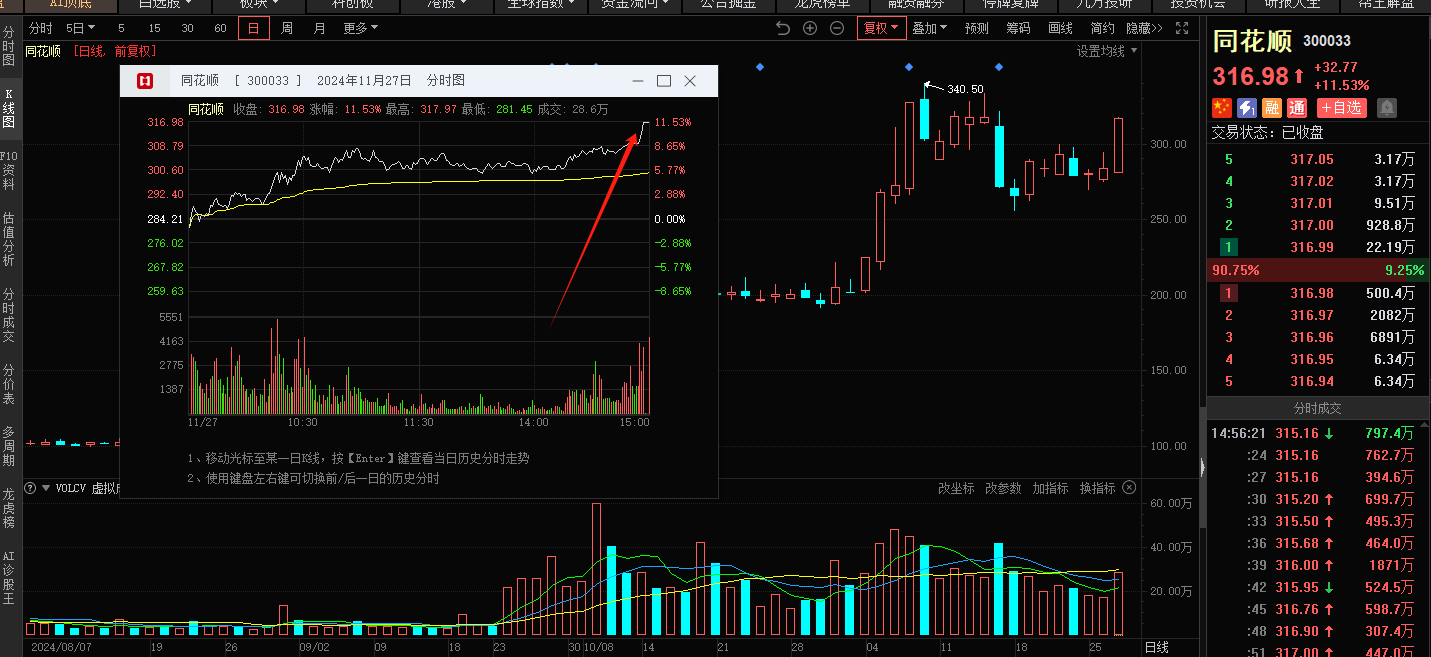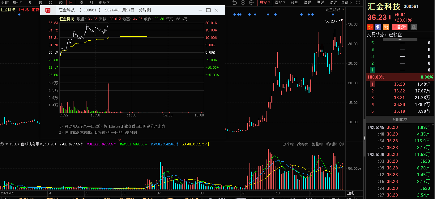 午盘后,指数回流,市场出现量价齐升,寒武纪再次突破历史新高,而尾盘由于成交量已经下不去了,市场选择的是金融继续发散,当前这个阶段互金板块与券商板块相对来说赚钱效应较好且筹码也比较好,导致市场合力拉升到新高位置,尾盘出现大笔连续抢筹,就看明天能不能承接住继续带量上攻,这样指数就又会有新的预期出现了