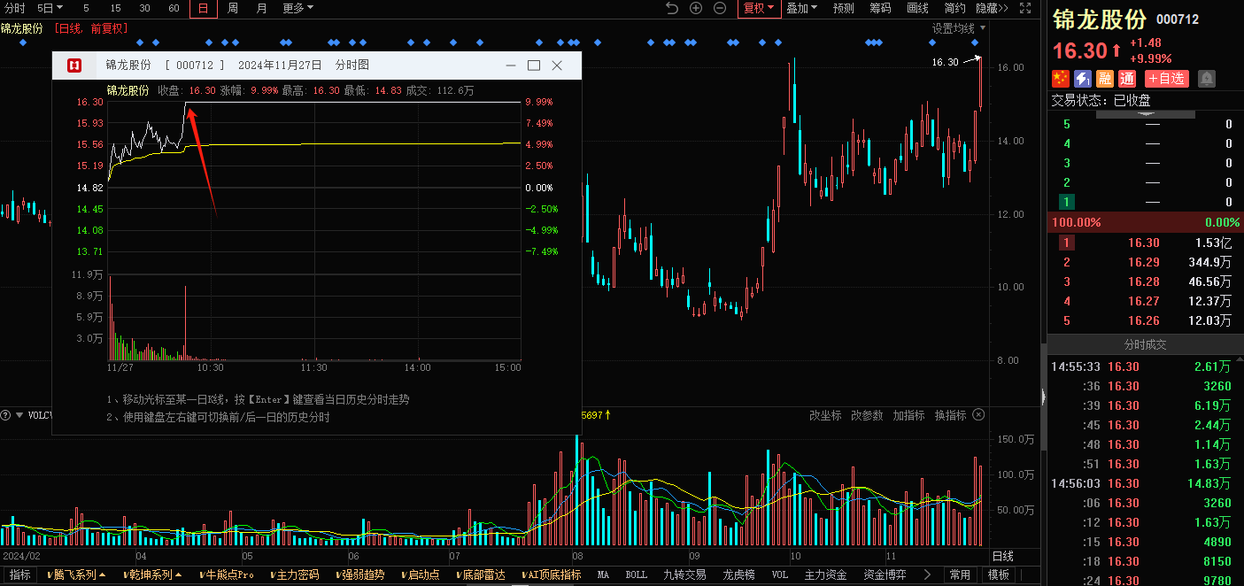 早上开盘资金抢筹出现回暖,比如昨日兑现的票东方智造、以及反复烂板的苏州科达直接出现修复,说明这里场内的资金(也就是接力的资金率先具备赚钱效应,把筹码流动性锁死)同时我们期待的大金融与大科技的放量也是成功来临,开盘主动表态的锦龙股份、300互金的汇金科技,情绪先修复之后,10.00左右锦龙股份上板: