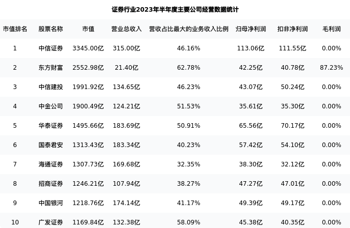 东方财富最新报告期数据为半年度,下表汇总了证券行业内市值靠前的公司半年度主要经营数据