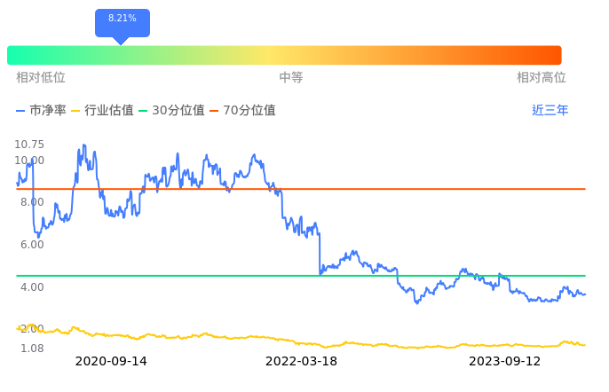 东方财富当前市净率PB为3.61,在所属的证券中,市净率PB排47,前五名分别为海通证券市净率0.80、华创云信市净率0.87、国元证券市净率0.90、国泰君安市净率0.93、哈投股份市净率0.97。东方财富当前市净率PB为3.61,超过近3年8.21%的历史数据。
