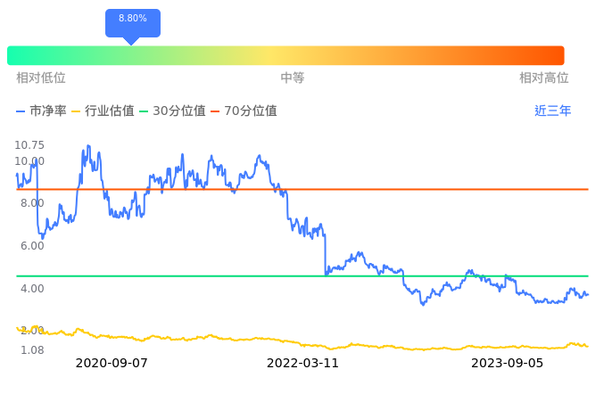 东方财富当前市净率PB为3.67,在所属的证券中,市净率PB排47,前五名分别为海通证券市净率0.78、华创云信市净率0.84、国元证券市净率0.90、国泰君安市净率0.91、哈投股份市净率0.97。东方财富当前市净率PB为3.67,超过近3年8.80%的历史数据。