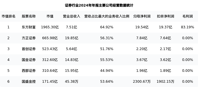 东方财富最新报告期数据为年报,下表汇总了证券行业内市值靠前的公司年报主要经营数据
