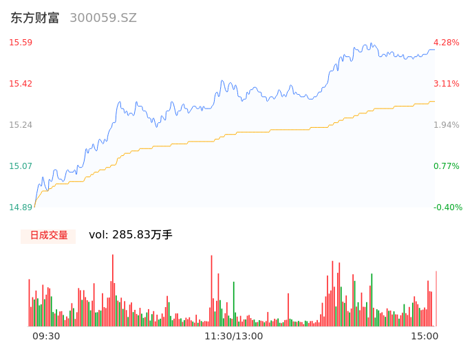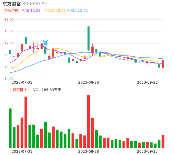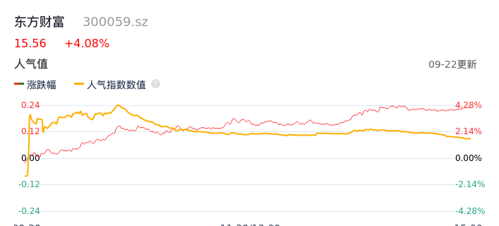 09月22日,东方财富收报15.56,股价涨幅4.08%,成交金额43.85亿元,换手率2.13%。