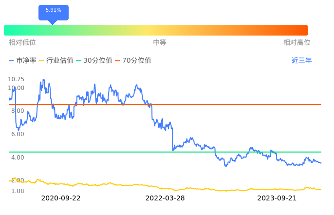 东方财富当前市净率PB为3.46,在所属的证券中,市净率PB排47,前五名分别为海通证券市净率0.79、国元证券市净率0.88、国泰君安市净率0.91、长江证券市净率0.94、华创云信市净率0.95。东方财富当前市净率PB为3.46,超过近3年5.91%的历史数据。