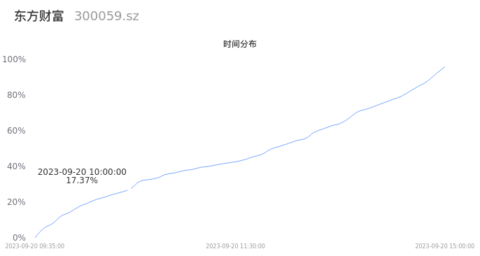 300059东方财富2023年09月20日成交97.05万手,成交金额14.86亿元,相较昨日缩量25.10万手,换手率0.72%,成交清淡。