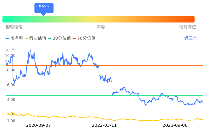 东方财富当前市净率PB为3.62,在所属的证券中,市净率PB排47,前五名分别为海通证券市净率0.77、华创云信市净率0.83、国元证券市净率0.89、国泰君安市净率0.91、华西证券市净率0.97。东方财富当前市净率PB为3.62,超过近3年8.65%的历史数据。