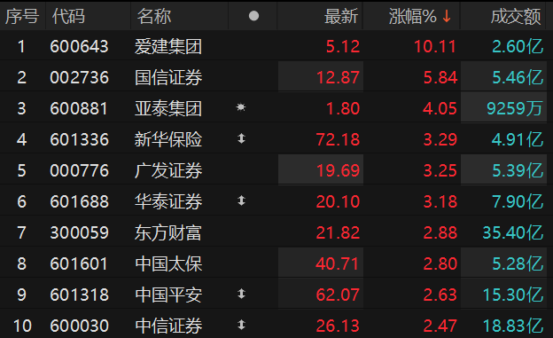 上证报中国证券网讯 3月17日,金融板块走强,截至10时03分,爱建集团涨停,国信证券涨近6%,新华保险、广发证券、华泰证券、东方财富、中国太保、中国平安等跟涨。