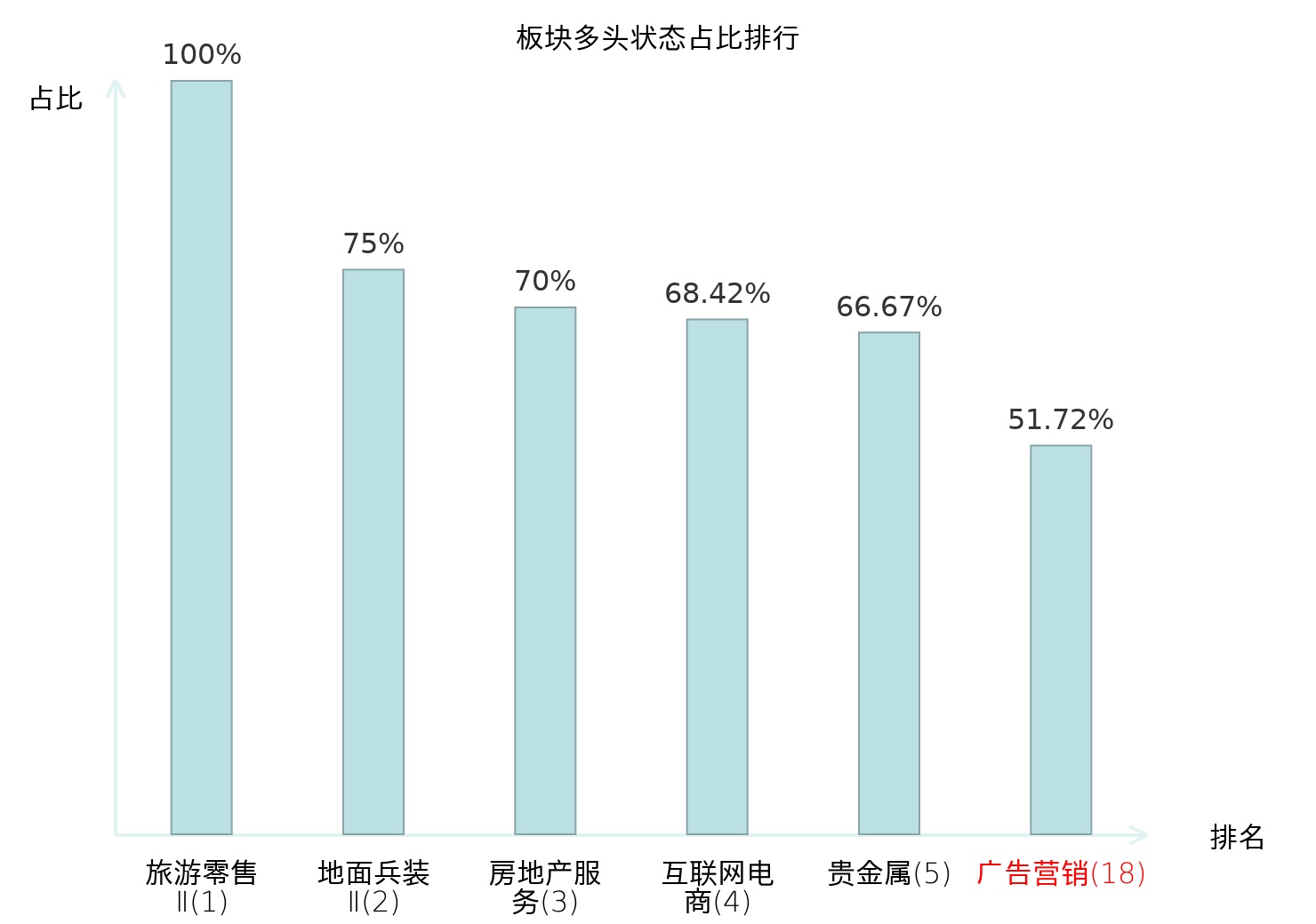 全市场所有行业板块中主力多头状态占比排名中,旅游零售Ⅱ板块位居第一。白色家电板块名次提升最快,较昨日上升65位。