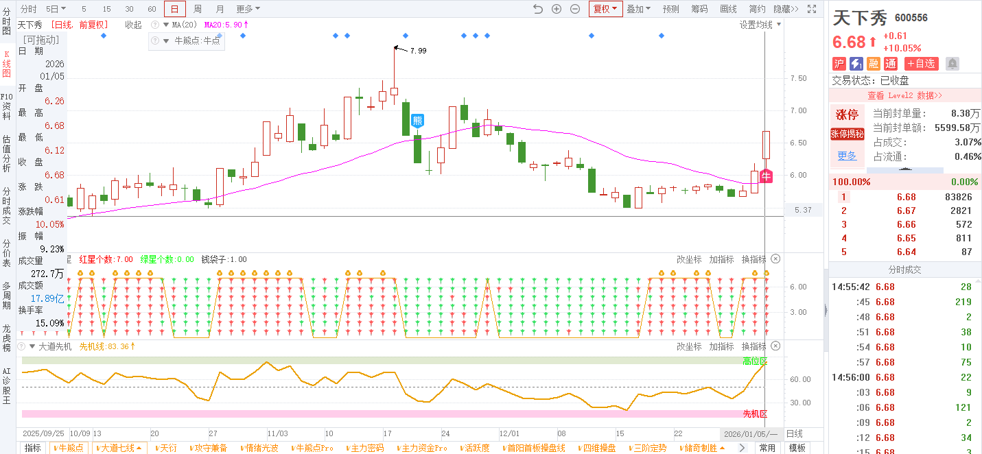 3)参考技术指标:20260105-天下秀-600556-大道七线-日线突破1号线和2号线,大道七星全红;20260105-天下秀-600556-牛熊点指标-日线出现牛点信号;