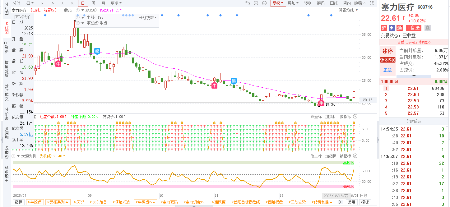 3)参考技术指标:20251222-塞力医疗-603716-大道七线-日线出现笑脸信号,大道七星全红;20251218-塞力医疗-603716-牛熊点指标-日线出现牛点信号;