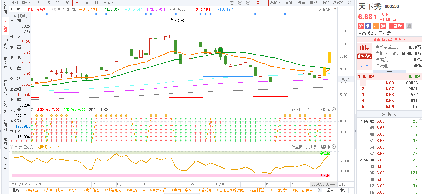 2)20260105-天下秀-600556-大道七线-日线突破1号线和2号线,大道七星全红;