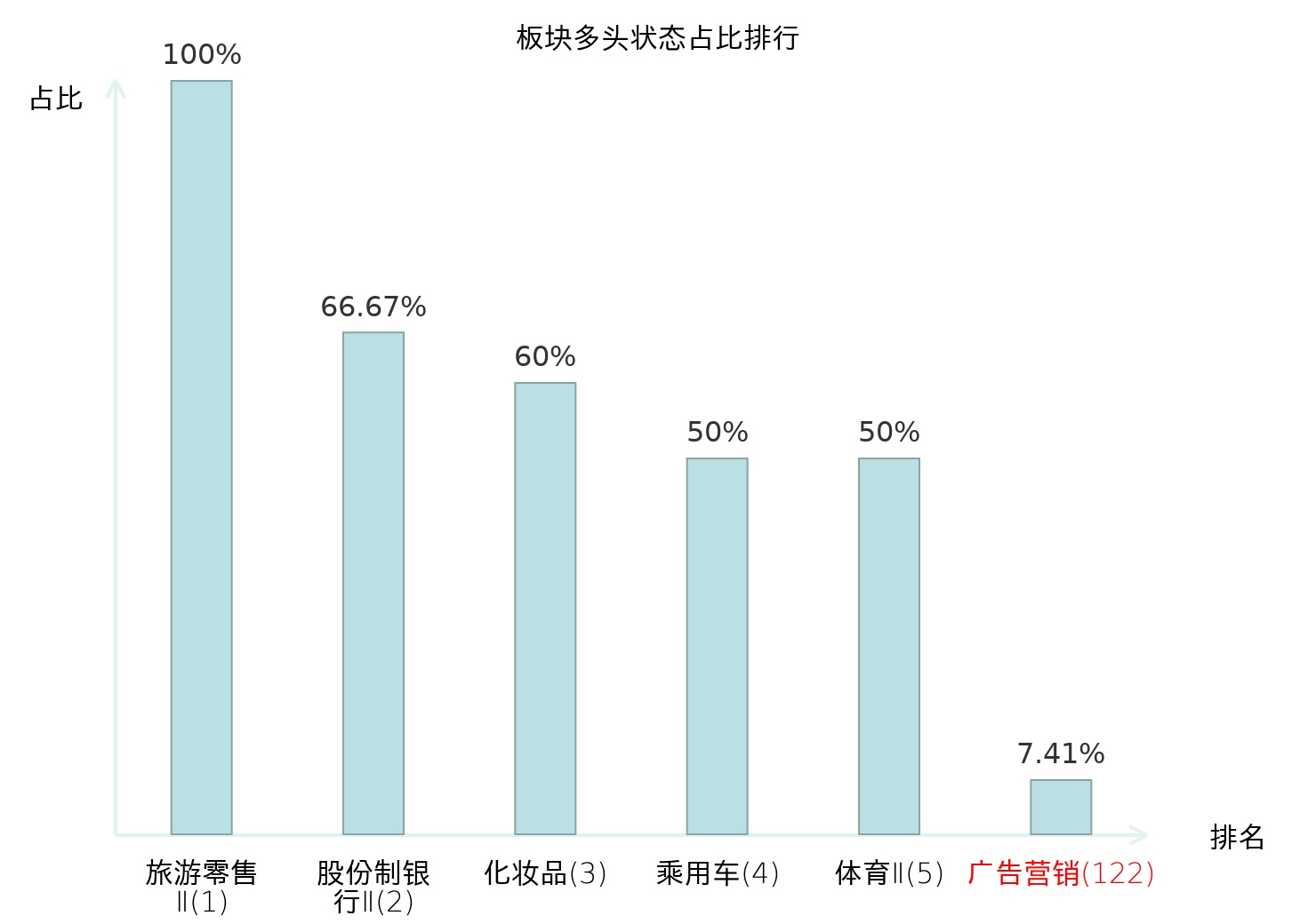 全市场所有行业板块中主力多头状态占比排名中,旅游零售Ⅱ板块位居第一。旅游零售Ⅱ板块名次提升最快,较昨日上升130位。