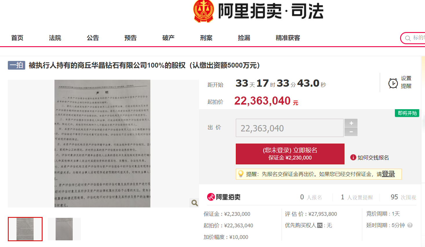 还值得一提的是,第一财经记者注意到,阿里拍卖网站平台显示,*ST金刚的控股子公司商丘华晶钻石有限公司(下称“商丘华晶”)100%股权将于11月29日进行公开拍卖,起拍价格2236.30万元。
