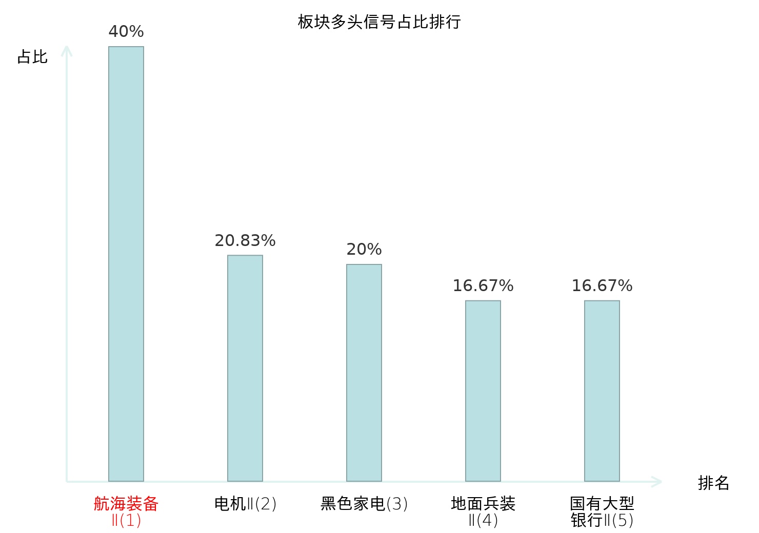 全市场所有行业板块中主力多头信号占比排名中,航海装备Ⅱ板块位居第一。国有大型银行Ⅱ板块名次提升最快,较昨日上升119位。