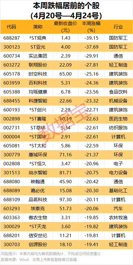 本周累计下跌的个股中,20股跌幅在20%以上,*ST观典一周累计跌39.15%,居首;ST亚光、实达集团、联翔股份、时空科技等累计跌幅均超20%。