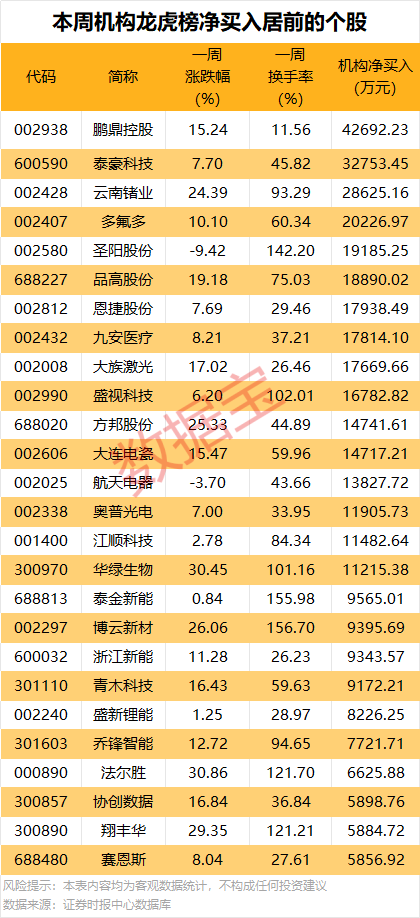 龙虎榜数据显示,本周机构专用席位共现身127股龙虎榜,净买入64股,净卖出63股。其中,50股获机构净买入均超千万元,鹏鼎控股、泰豪科技等16股机构净买入金额均超1亿元。
