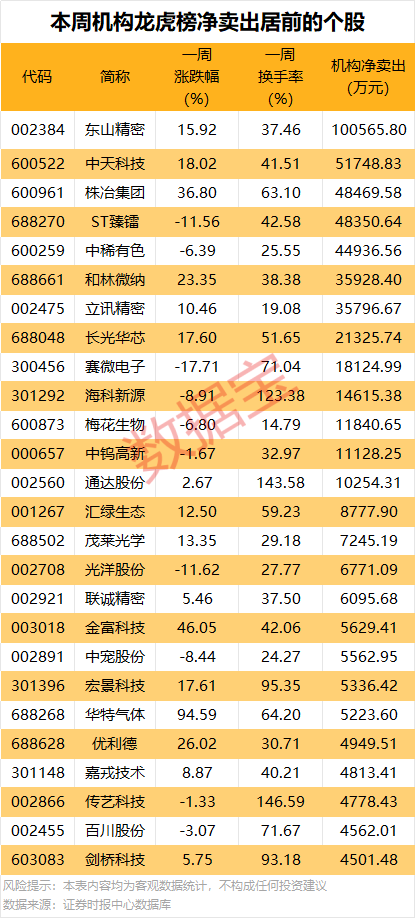 一周机构累计净卖出的个股中,13股金额均超1亿元。其中净卖出金额最多的是东山精密,该股本周累计上涨15.92%,一周换手率为37.46%,因日涨幅偏离值达9%上榜龙虎榜;买卖居前营业部中机构合计净卖出10.06亿元,同时上榜的还有深股通专用席位,净卖出2.97亿元;营业部席位一周合计净买入14.44亿元。