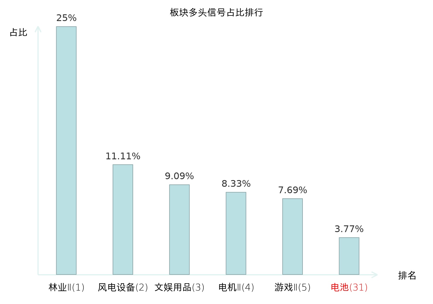 全市场所有行业板块中主力多头信号占比排名中,林业Ⅱ板块位居第一。林业Ⅱ板块名次提升最快,较昨日上升124位。