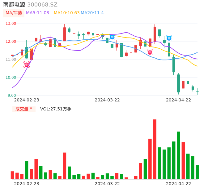 南都电源在4月12日出现日线级别熊点,从熊点信号发出到今日7日内累积跌幅已经达到17.44%,股价近期跌幅巨大,KD指标数值为:18.37,已经出现超卖信号,短期套牢盘严重,如后期60分钟周期由熊转牛且基本面/消息面未发生重大变化则可能弱势反弹。
