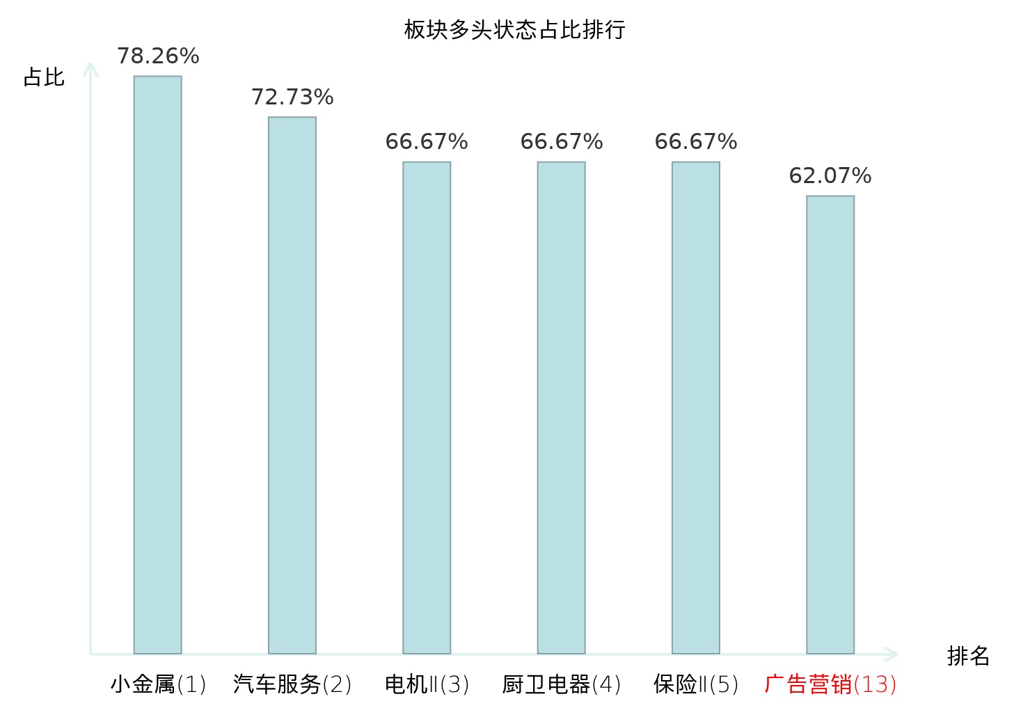 全市场所有行业板块中主力多头状态占比排名中,小金属板块位居第一。农业综合Ⅱ板块名次提升最快,较昨日上升88位。