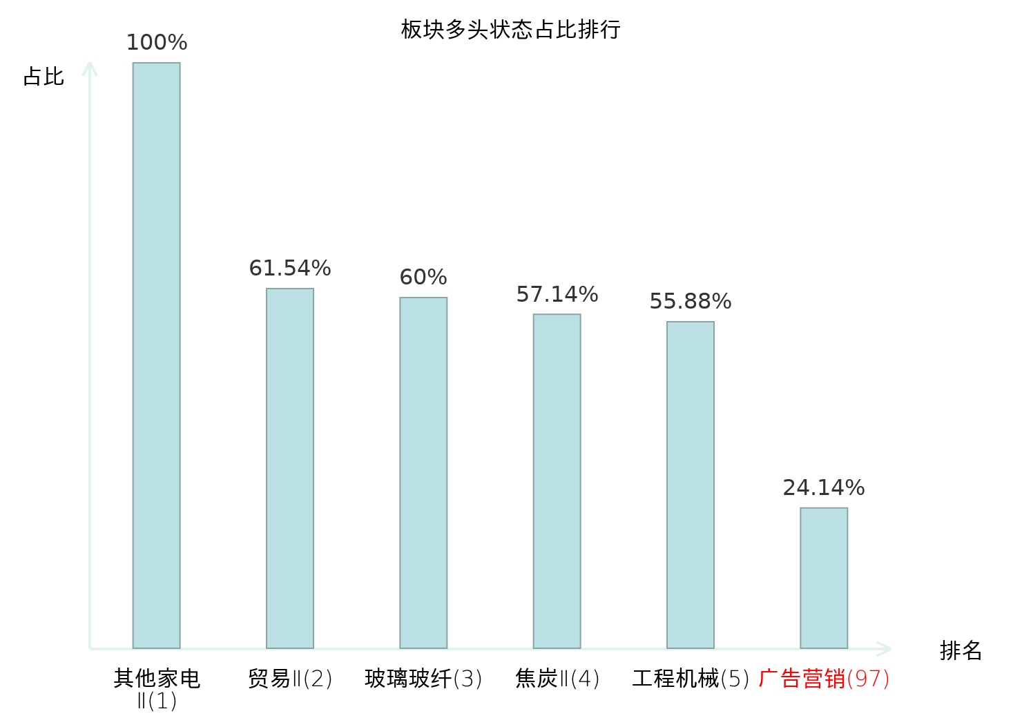全市场所有行业板块中主力多头状态占比排名中,其他家电Ⅱ板块位居第一。航海装备Ⅱ板块名次提升最快,较昨日上升98位。