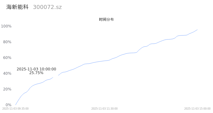 300072海新能科2025年11月03日成交33.93万手,成交金额1.39亿,相较昨日缩量21.47万手,换手率1.46%,成交清淡。