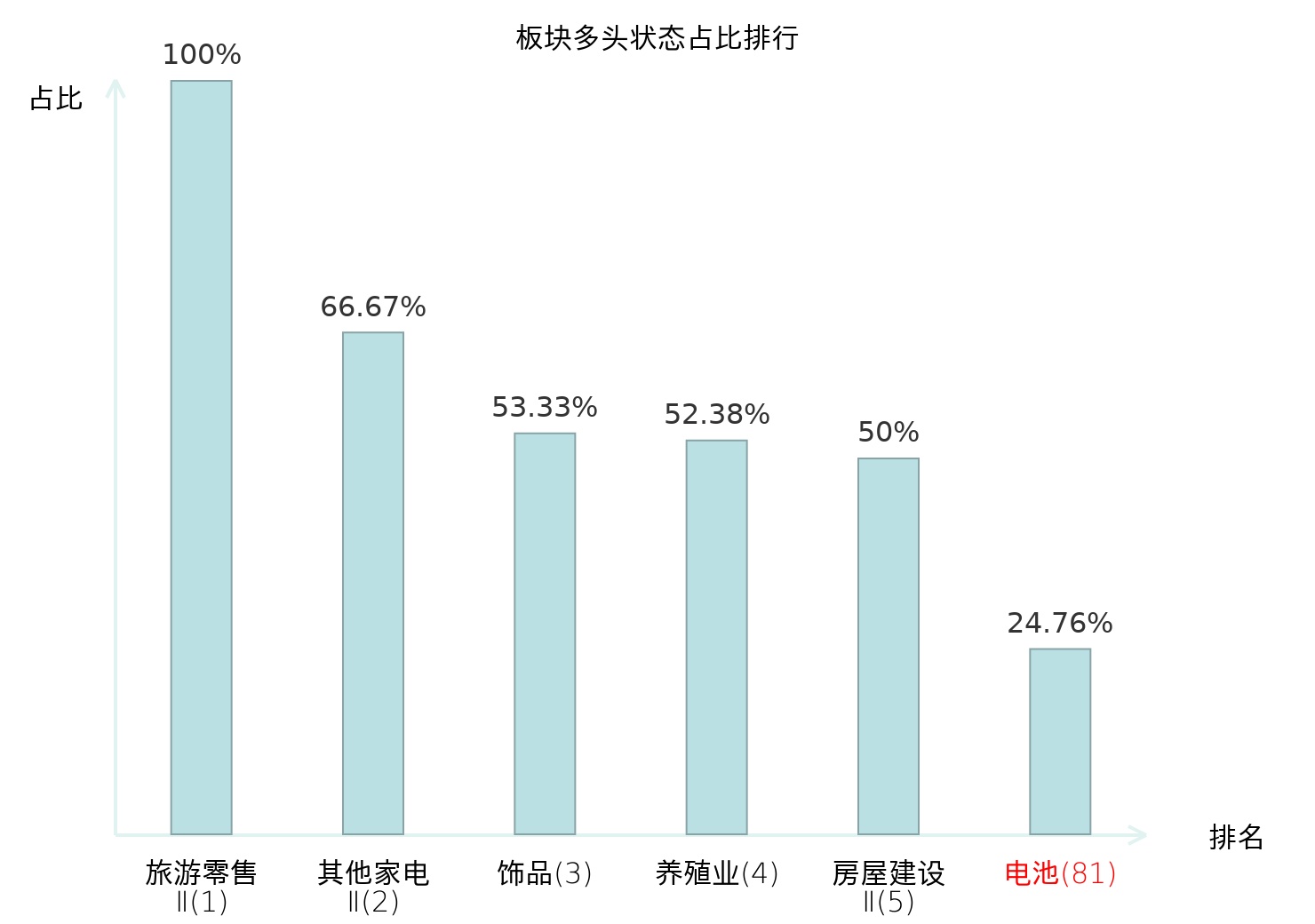 全市场所有行业板块中主力多头状态占比排名中,旅游零售Ⅱ板块位居第一。体育Ⅱ板块名次提升最快,较昨日上升93位。