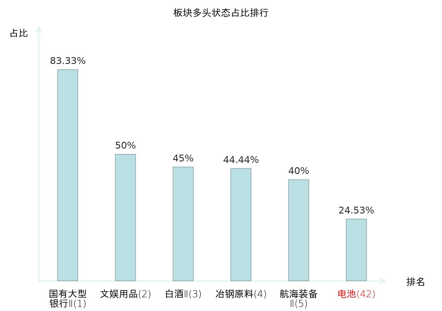 全市场所有行业板块中主力多头状态占比排名中,国有大型银行Ⅱ板块位居第一。其他家电Ⅱ板块名次提升最快,较昨日上升116位。