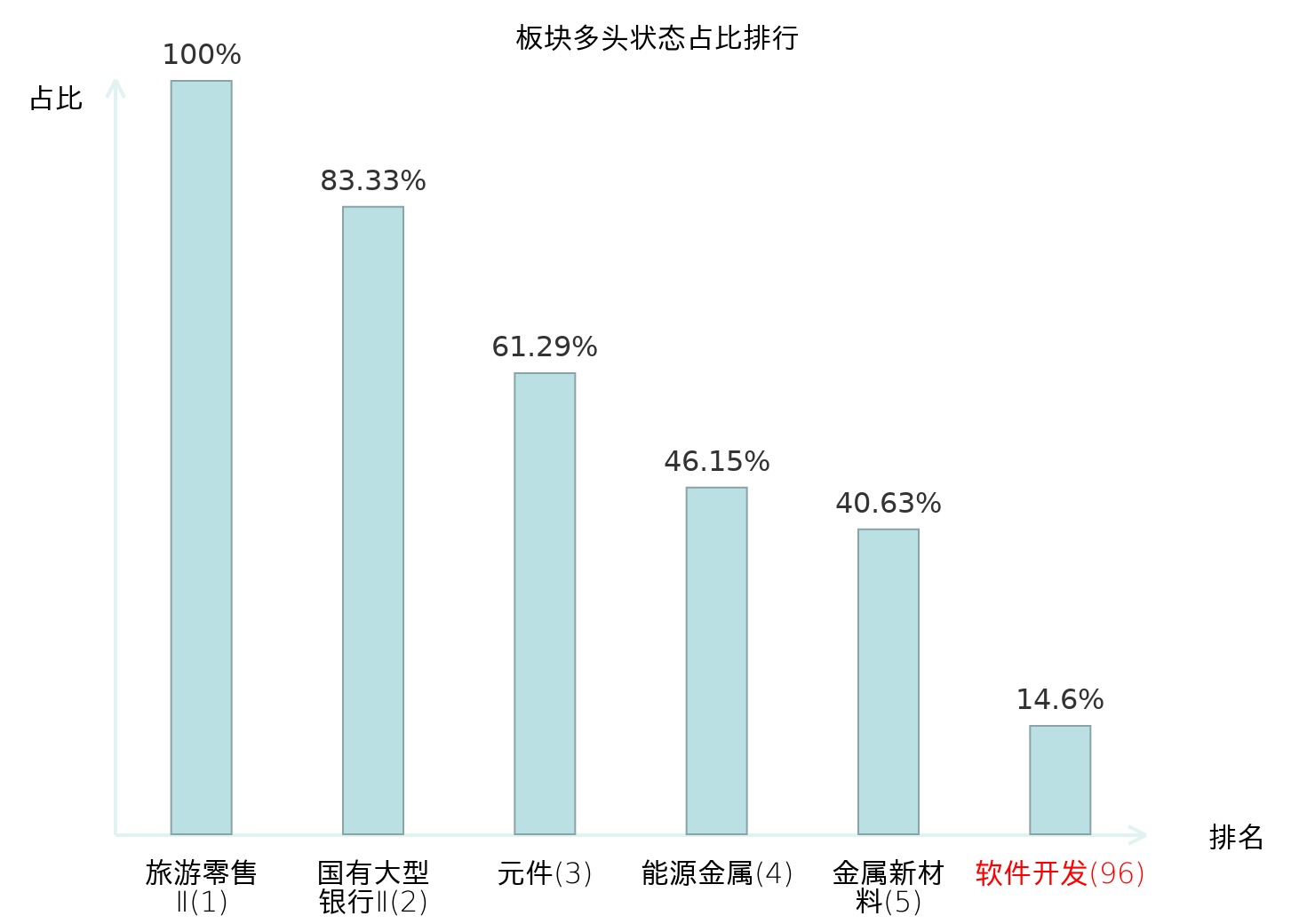 全市场所有行业板块中主力多头状态占比排名中,旅游零售Ⅱ板块位居第一。数字媒体板块名次提升最快,较昨日上升67位。