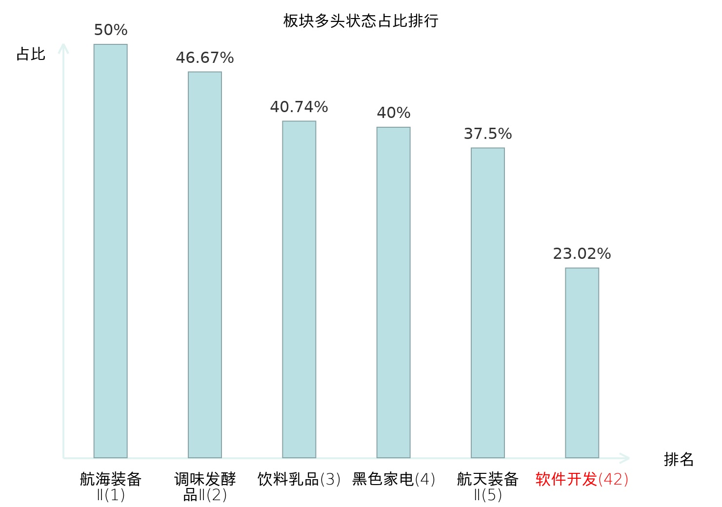 全市场所有行业板块中主力多头状态占比排名中,航海装备Ⅱ板块位居第一。航海装备Ⅱ板块名次提升最快,较昨日上升99位。