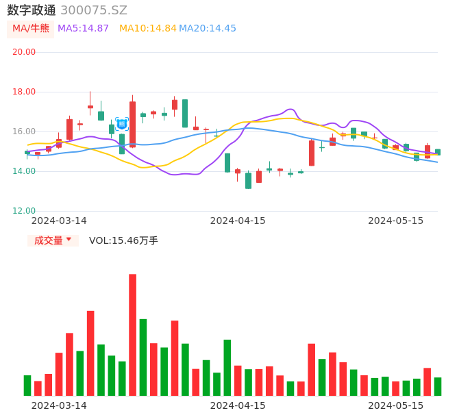 05月15日,数字政通收报14.81,股价涨幅-3.14%,成交金额2.31亿元,换手率3.00%。