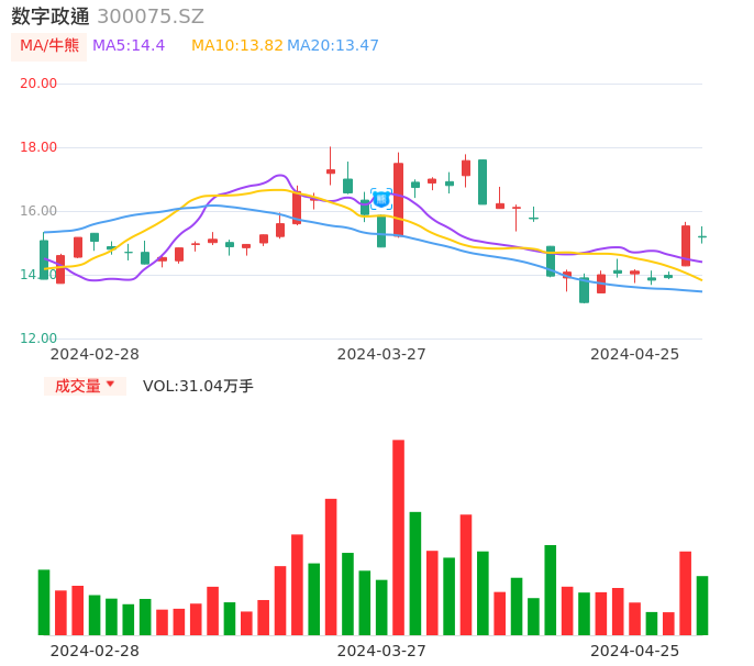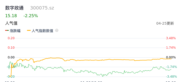 04月25日,数字政通收报15.18,股价涨幅-2.25%,成交金额4.72亿元,换手率6.03%。