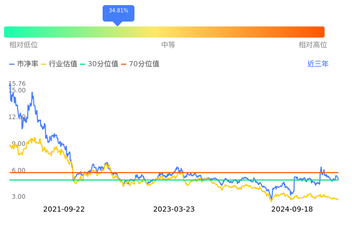 国民技术当前市净率PB为4.97,在所属的半导体中,市净率PB排135,前五名分别为闻泰科技市净率0.86、ST华微市净率0.87、灿瑞科技市净率0.94、燕东微市净率0.98、华虹公司市净率1.08。国民技术当前市净率PB为4.97,超过近3年34.81%的历史数据。