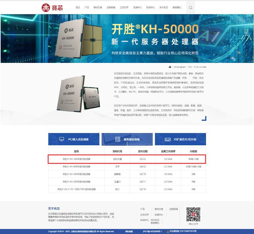 公司在稳固桌面PC市场领先地位的同时,亦积极布局和拓展服务器市场。继2025年云栖大会、中国国际通信展上开胜KH-50000芯片实物首秀之后,9月29日,兆芯集成官网公布了开胜KH-50000系列服务器处理器的更多规格细节。
