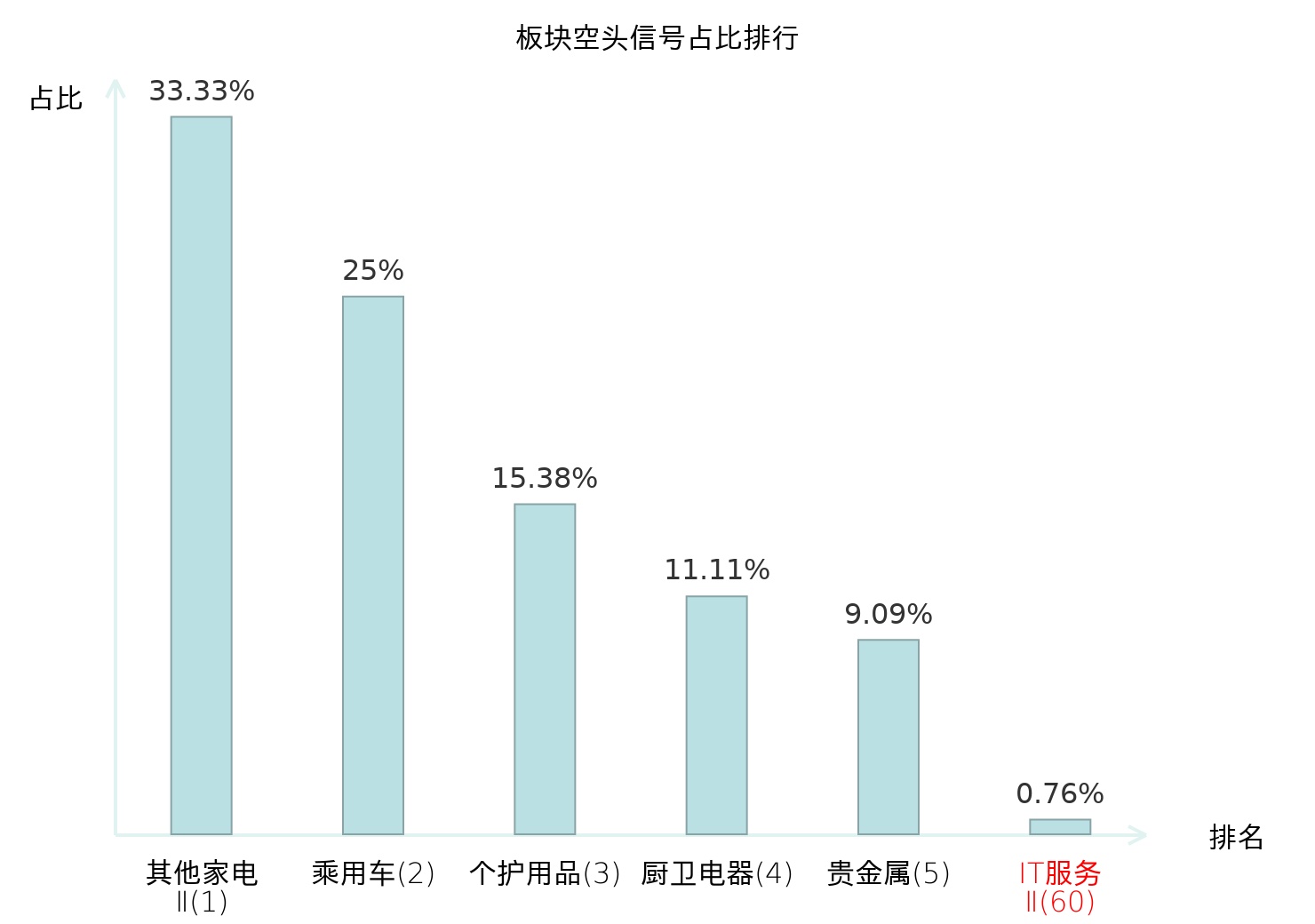 全市场所有行业板块中主力空头信号占比排名中,其他家电Ⅱ板块位居第一。个护用品板块名次提升最快,较昨日上升119位。