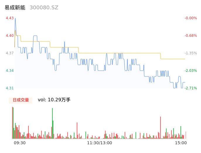 04月12日,易成新能收报4.33,股价涨幅-2.26%,成交金额4483.12万元,换手率0.79%。