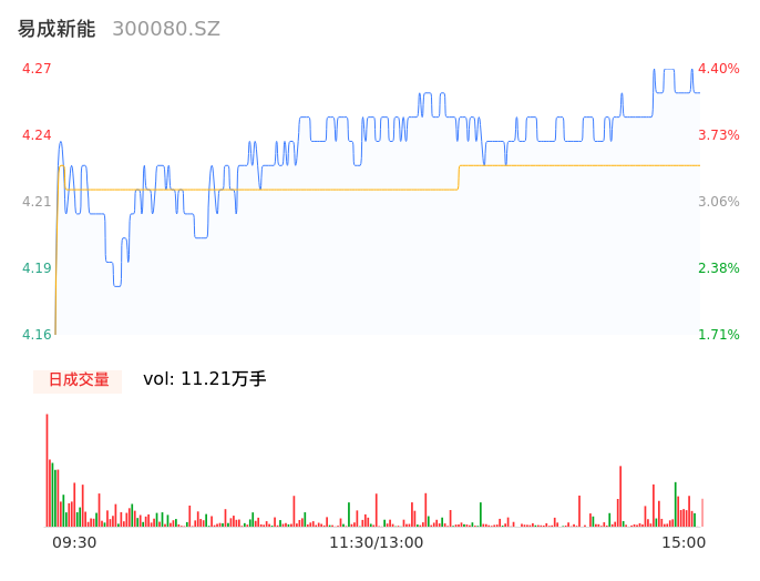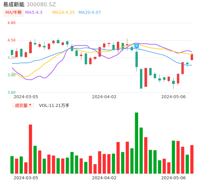 05月06日,易成新能收报4.26,股价涨幅4.16%,成交金额4744.81万元,换手率0.86%。